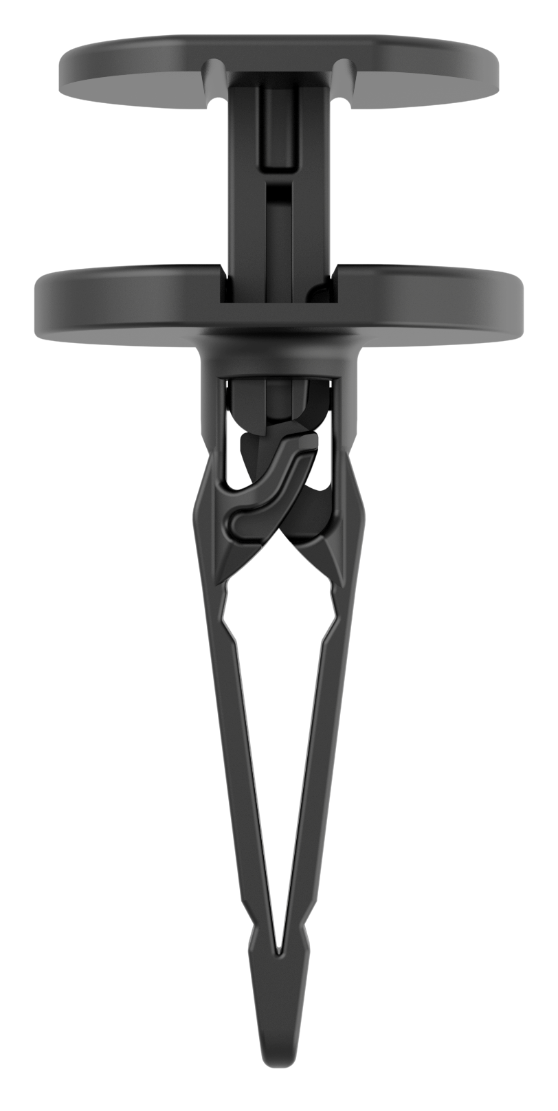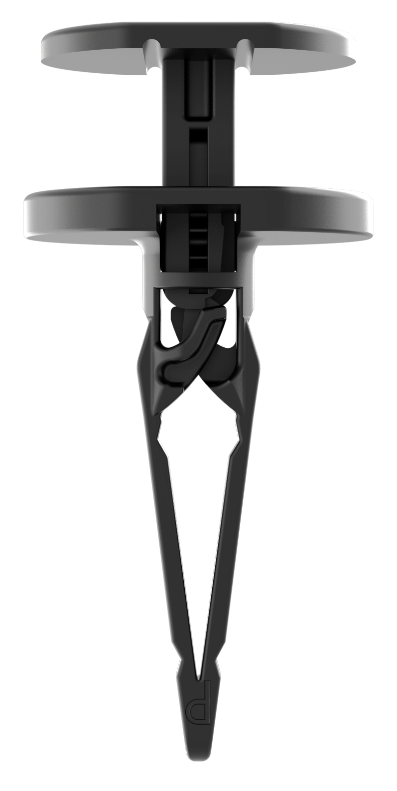 A designed lengthy lead in feature is rounded to find the hole and be fastened. The lock pin interacts with arc shaped legs that translate outward locking into