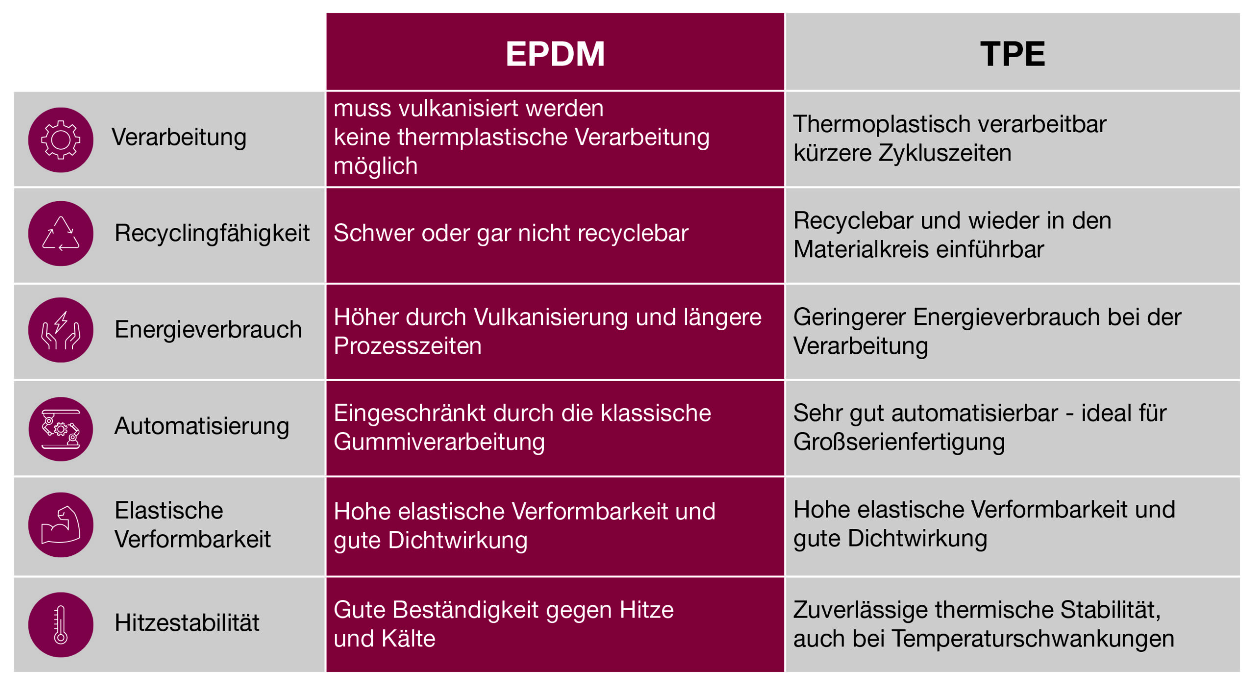 Thermoplastische Elastomere (TPE) bieten hier eine zukunftsweisende Alternative. Im Gegensatz zu herkömmlichen Gummimaterialien lassen sie sich thermoplastisch verarbeiten, wieder einschmelzen und in den Stoffkreislauf zurückführen. Für die industrielle Serienfertigung bedeutet das: kürzere Zykluszeiten, geringerer Energieaufwand, bessere Automatisierbarkeit – und die Möglichkeit, Rezyklate direkt einzusetzen.