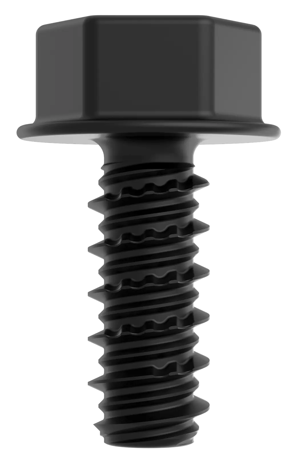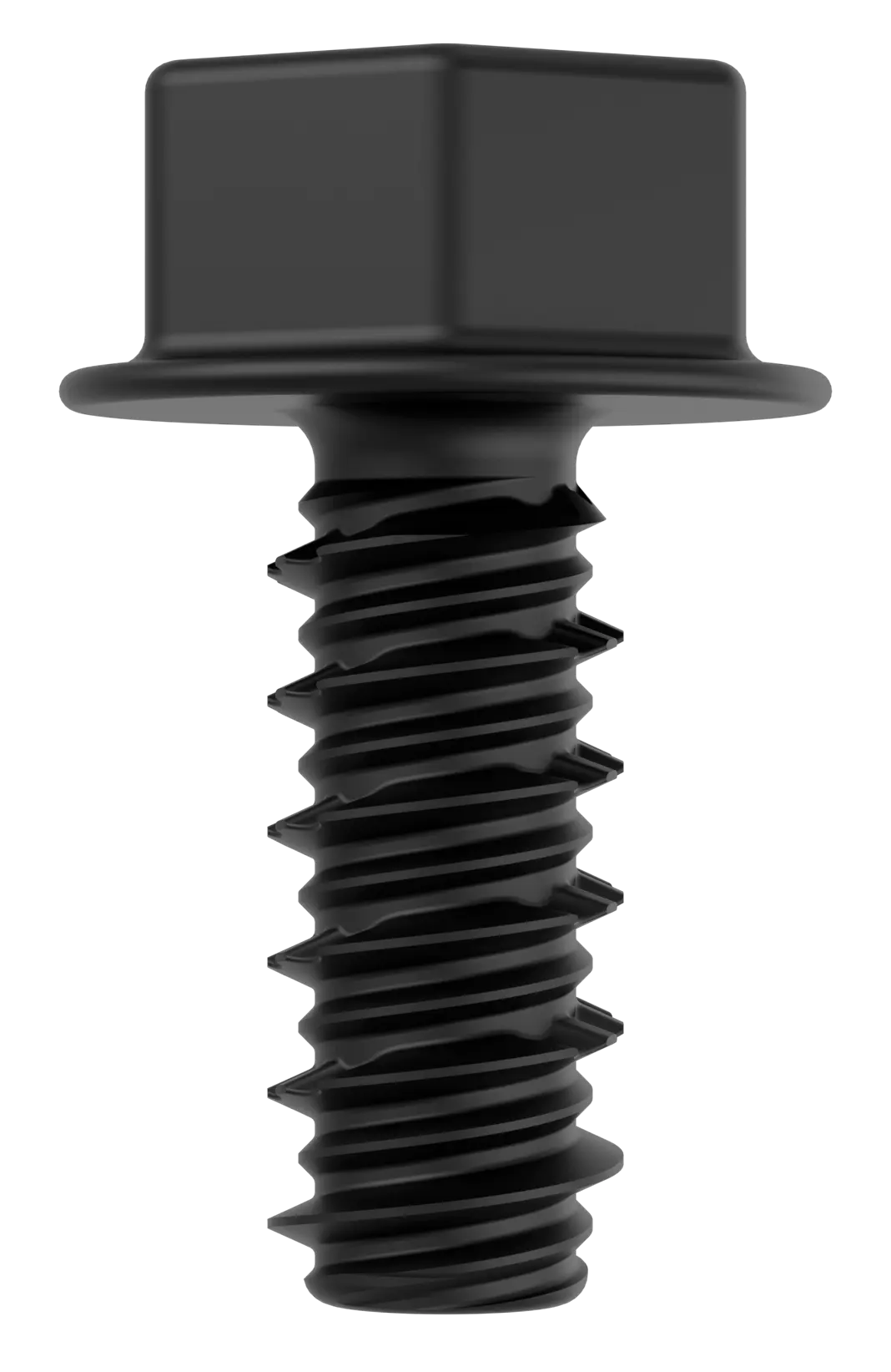 Eine gewindeformende Schraube für weiche Werkstoffe – mit speziellen Drucktaschen im Gewinde, die die Schraube sicher in Position halten.