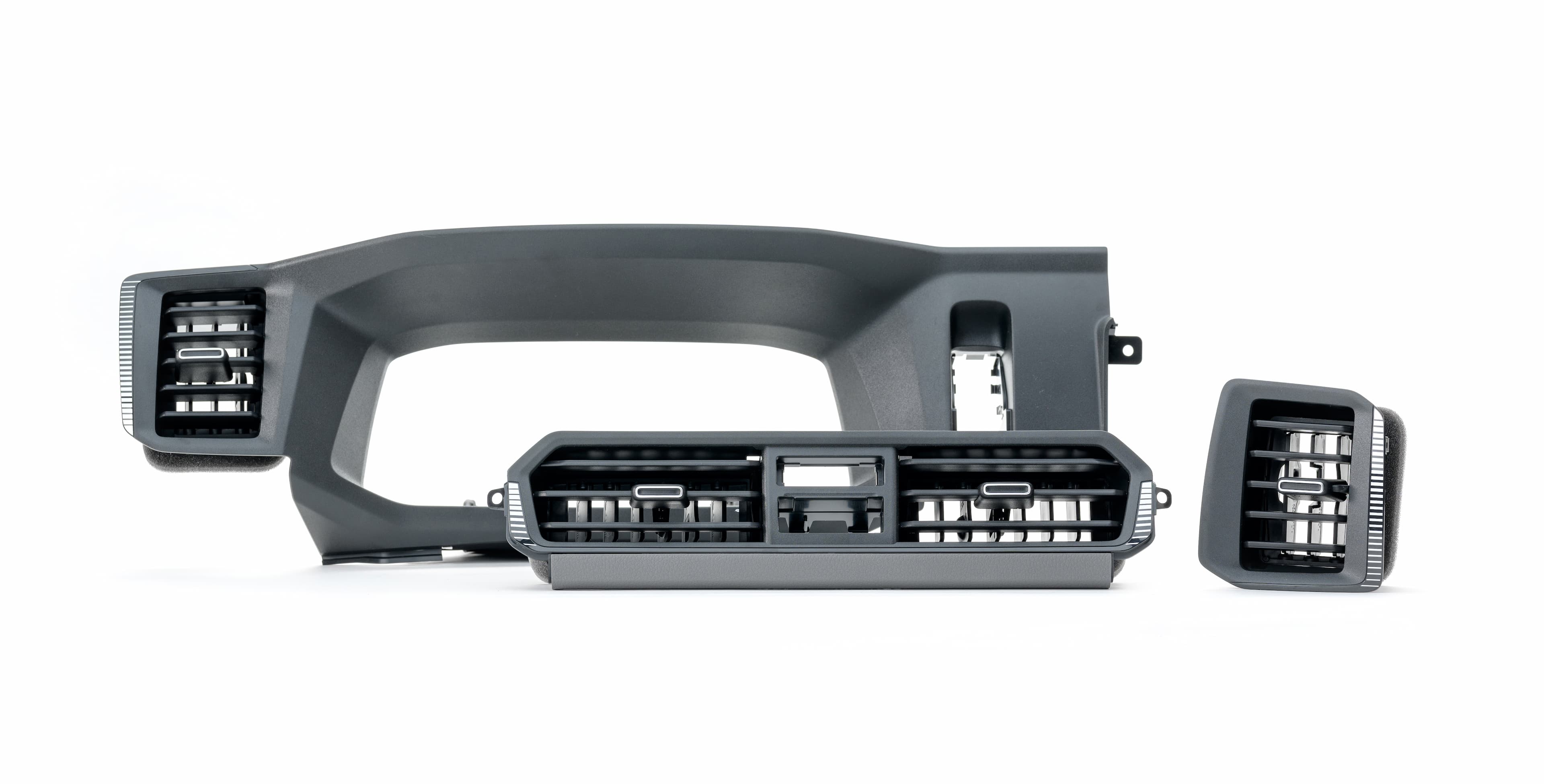 Die Luftausströmer von ITW Automotive unterstützen die Ziele der CO2-Reduzierung aufgrund der umfangreichen Erfahrung bei der Konstruktion großer Teile aus recycelten Materialien. Die Verwendung von recyceltem Material wird mit einer Materialoptimierung im Einzelteildesign kombiniert.